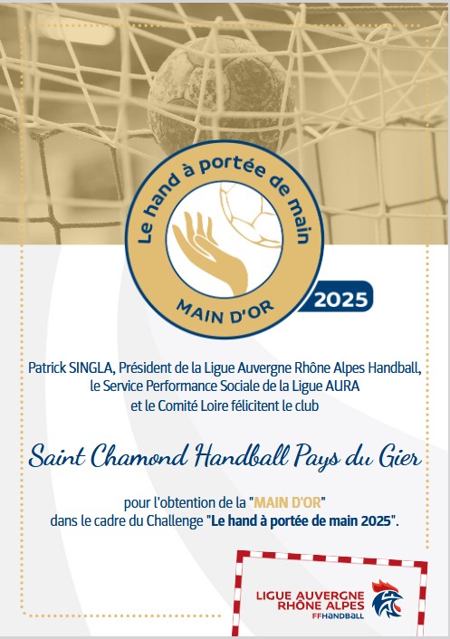 La Ligue Auvergne Rhône Alpes Handball, par l’intermédiaire de son service Performance Sociale et en collaboration avec son Comité Départemental, a décidé d’accorder au club de ST CHAMOND HANDBALL PAYS DU GIER la « Main d’Or » pour le challenge club AURA pour l’année 2025.