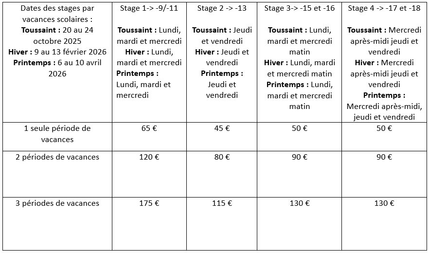 Pour profiter du tarif dégressif, l’entièreté du paiement est à faire lors du premier stage de Toussaint.